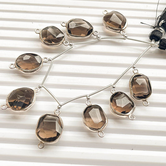 Smoky Quartz uneven faceted tumble 925 Silver bezel set Connectors for Jewelry making