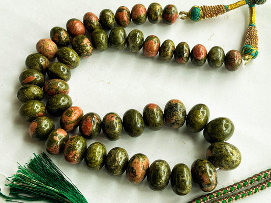 Unakite, with its blend of green and pink hues, is known for promoting emotional healing, balance, and spiritual growth. Its earthy colors make it a unique choice for jewelry.