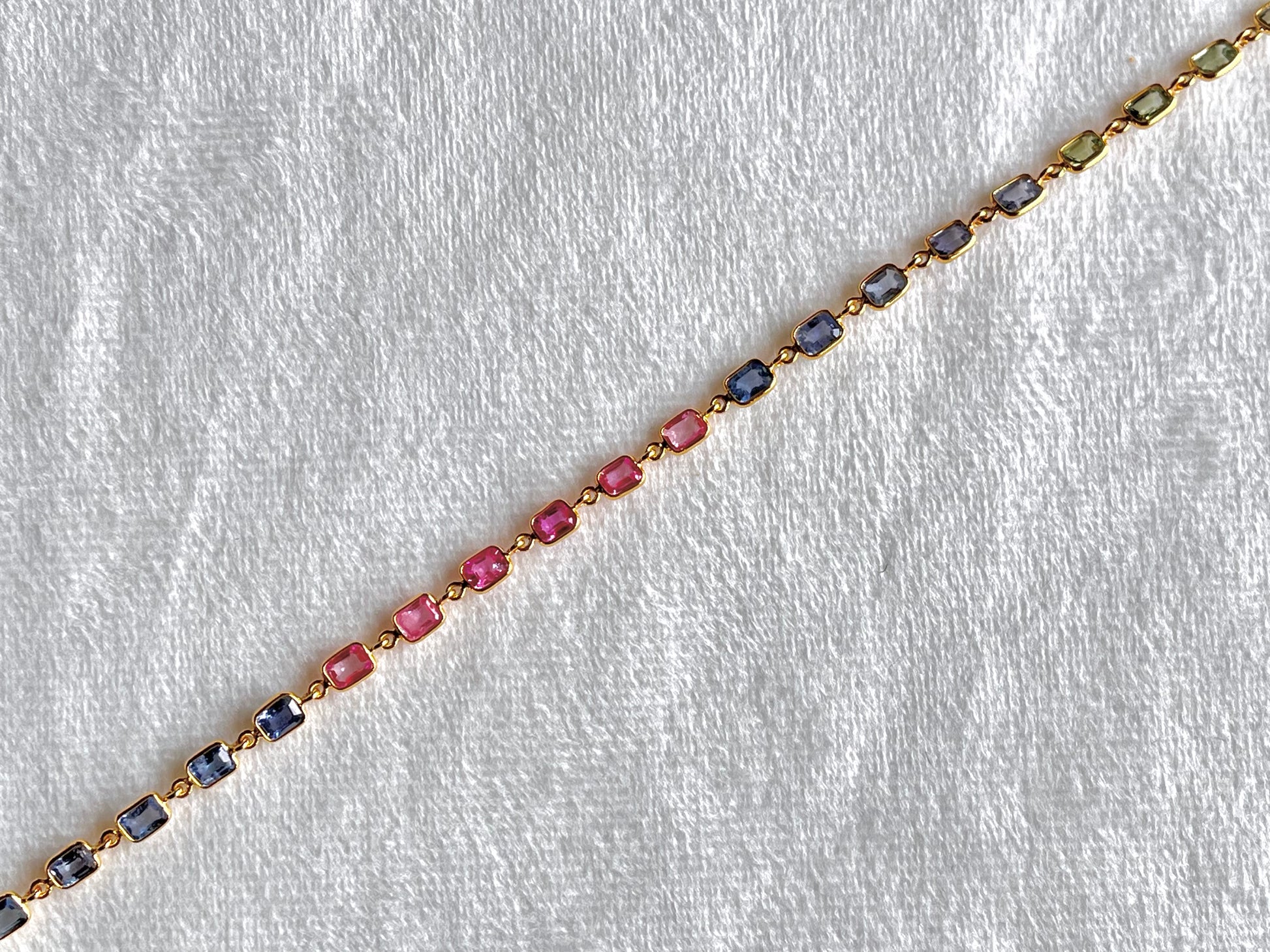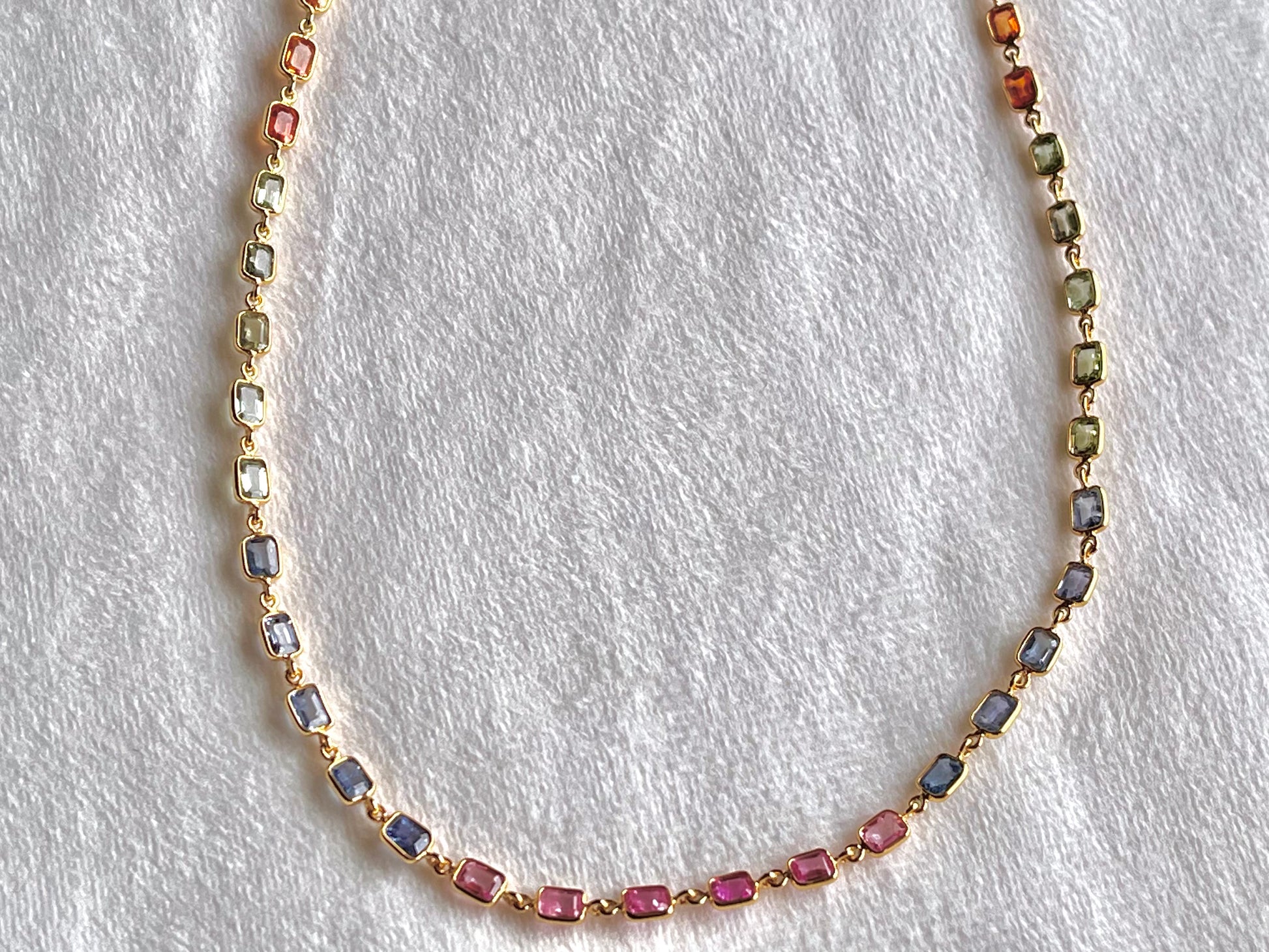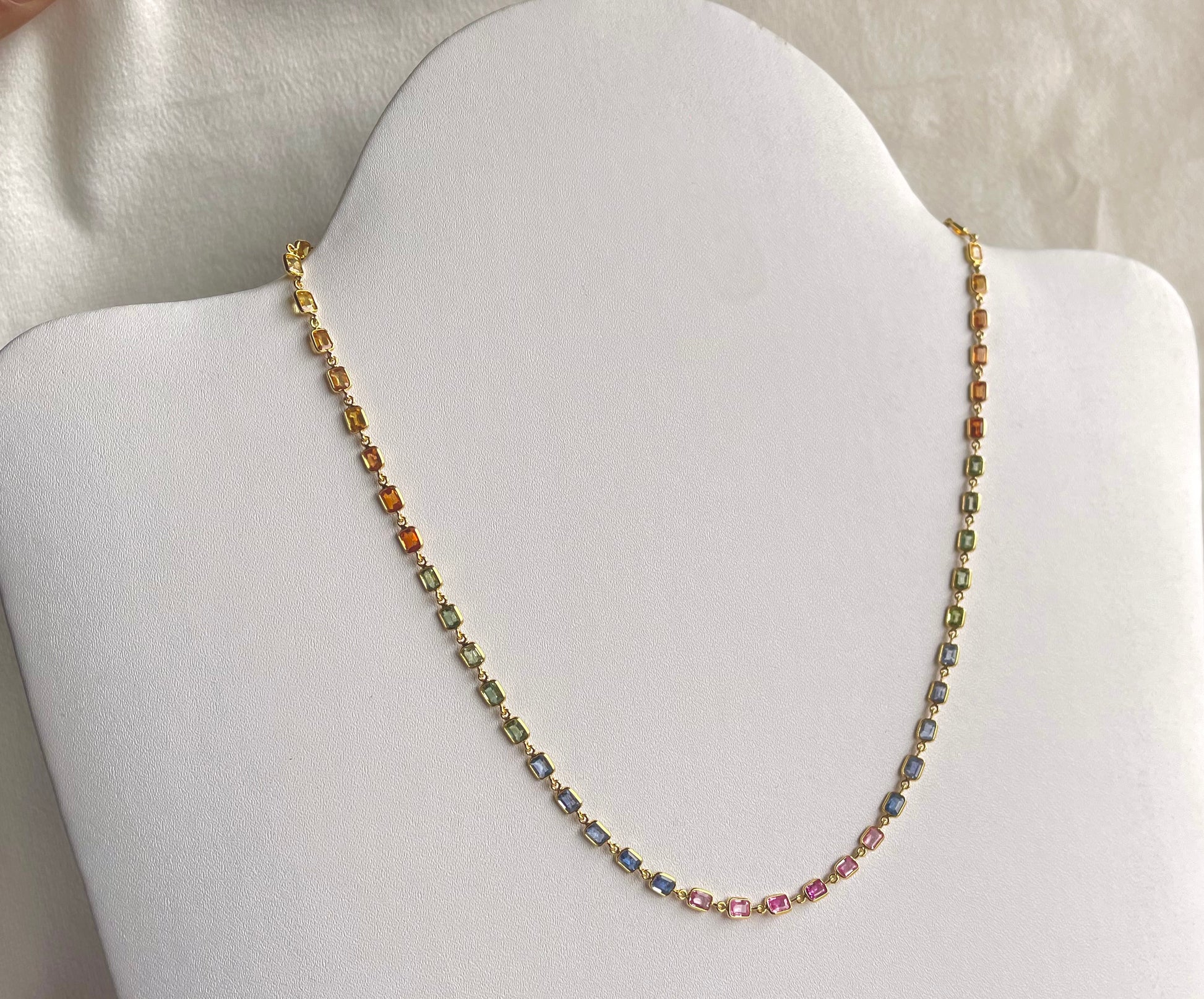 Experience the timeless elegance of our Rainbow Sapphire Octagon Bezel Set Necklace, crafted in 18K Gold. Each sapphire is hand-cut and bezel-set to create a seamless, vibrant flow of colors that radiate luxury and craftsmanship. Perfect for layering or wearing solo β a true statement of refined beauty.