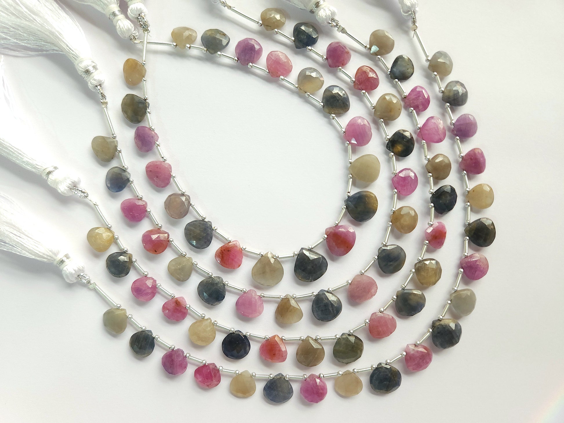 Elegant multi sapphire faceted heart shape beads with beautiful natural colors and brilliant faceting, perfect for creating unique handmade jewelry designs.