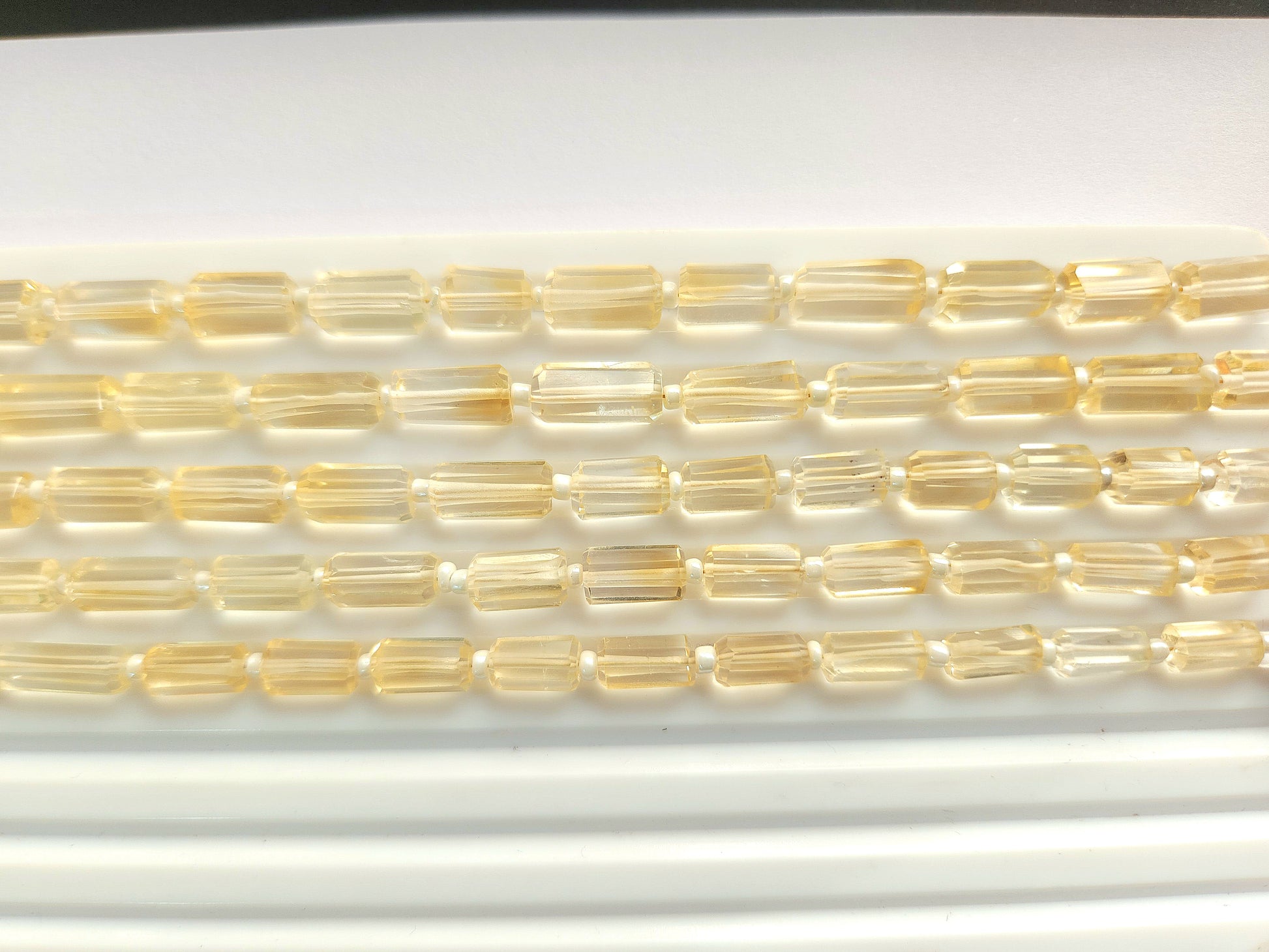 These Natural Citrine Faceted Cylindrical Gemstone Beads glow with warm golden-yellow hues that capture sunlight beautifully. Each bead is finely cut to enhance its brilliance and clarity. Perfect for creating radiant, positive-energy jewelry pieces like necklaces or bracelets.
