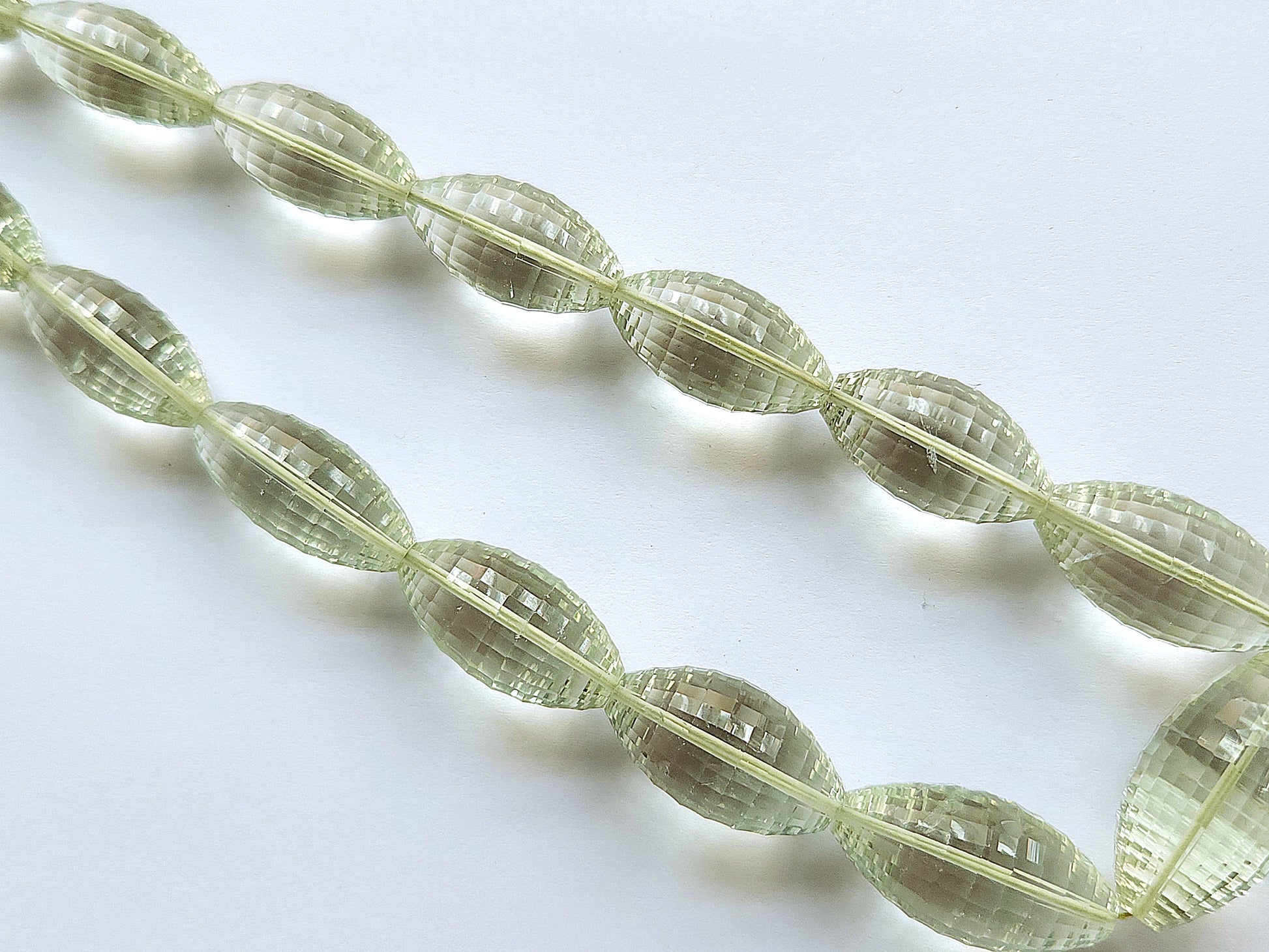 Enhance your jewelry designs with this stunning strand of Natural Green Amethyst Olive Shape Concave Cut Beads. Expertly cut with a precision concave faceting, each bead reflects light beautifully, creating exceptional brilliance and depth.