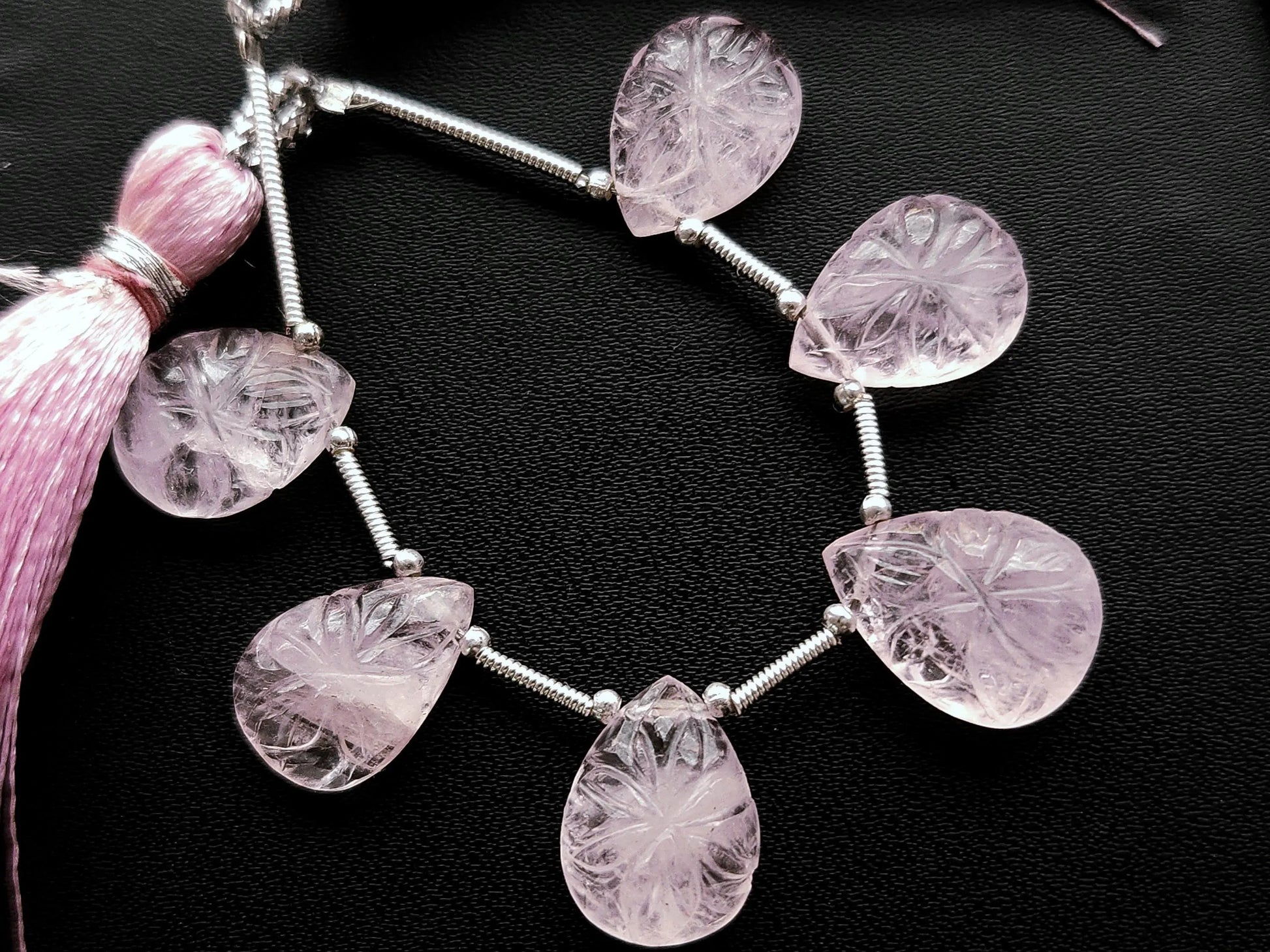 6 Pieces Natural Morganite Carved Pear Shaped Beads, Floral Carved Pink Morganite Drops, Hand-Carved Morganite Beads for Jewelry Making