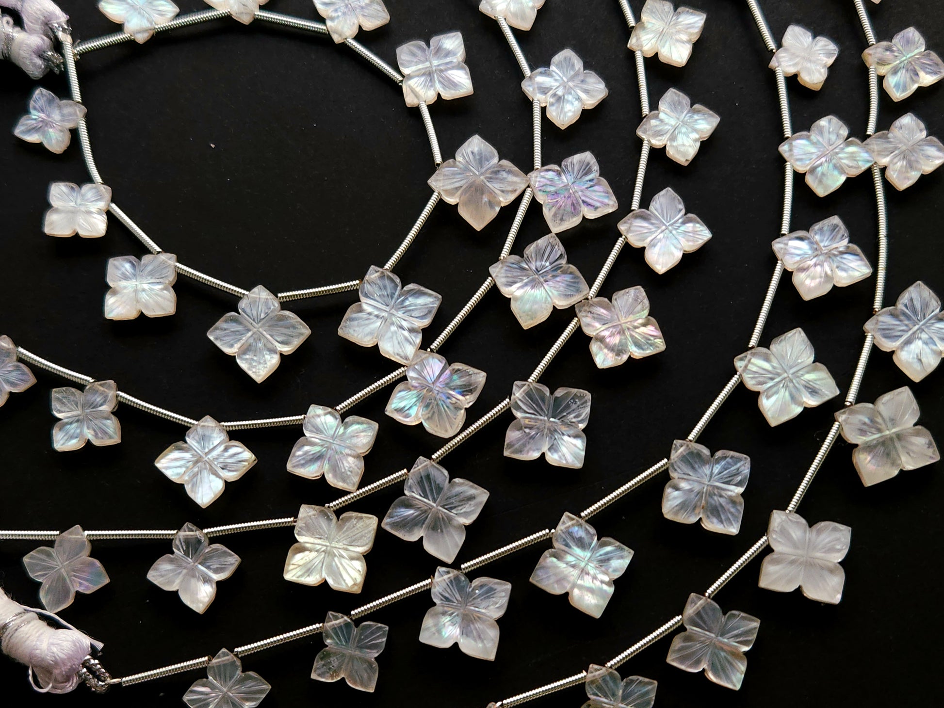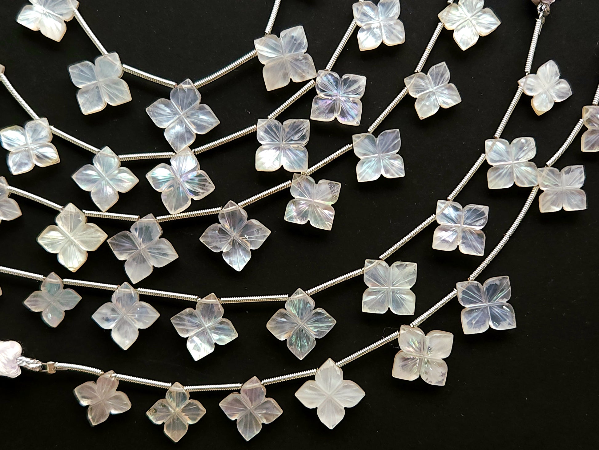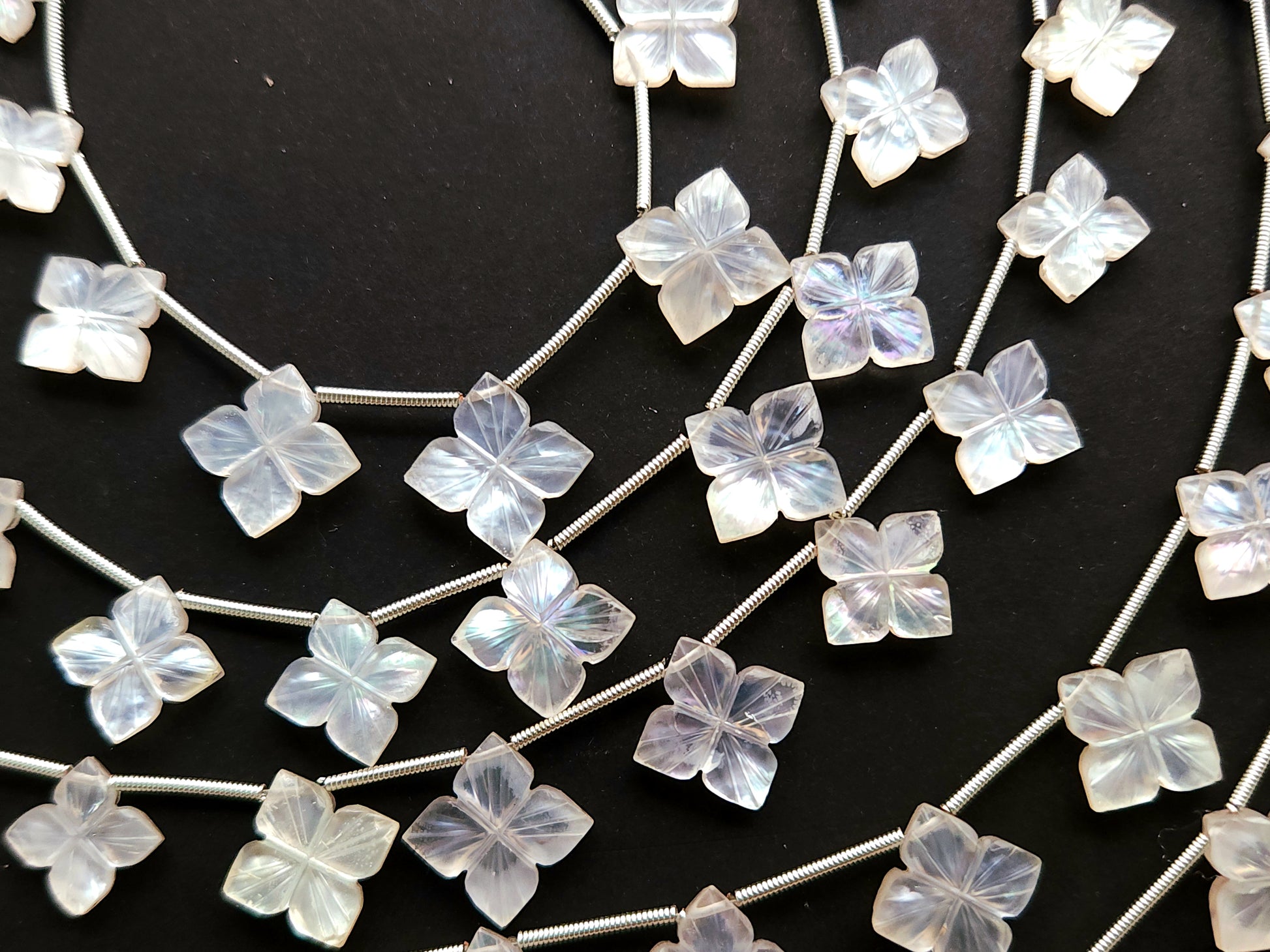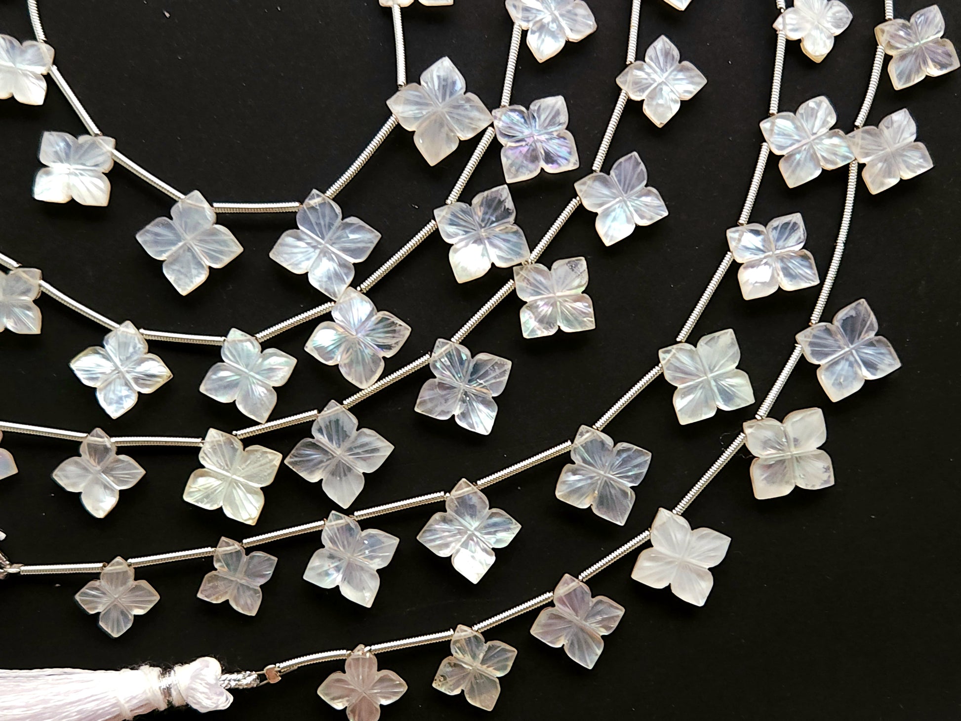 Natural Mother of Pearl and Crystal Triplet Flower Carved Square Shape Beads