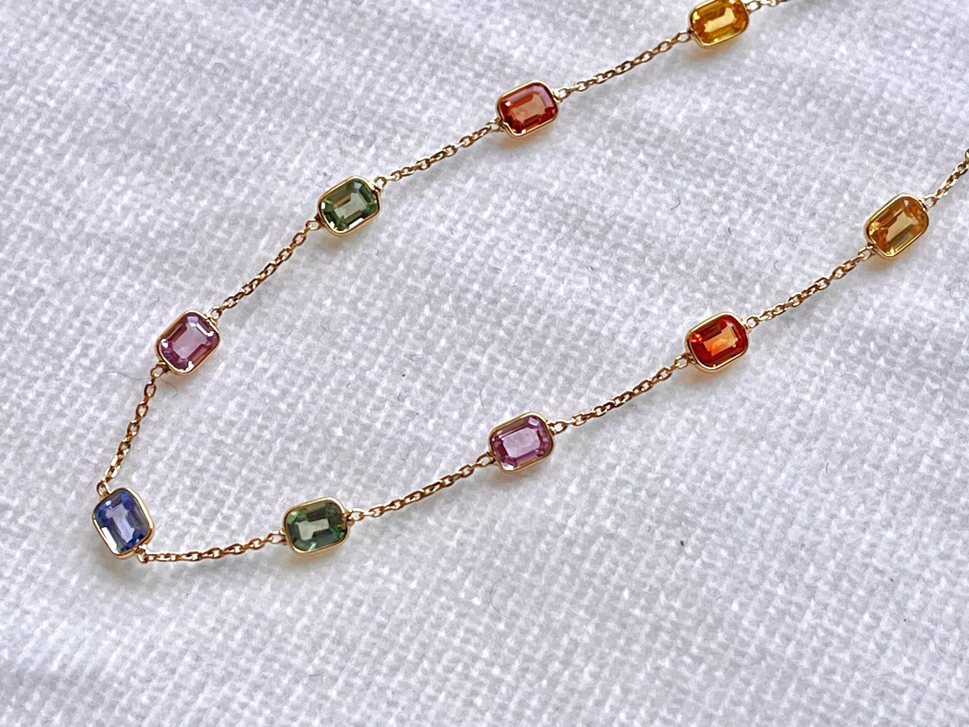Add subtle color and everyday elegance with this Rainbow Sapphire Bezel Set Chain Bracelet, crafted in solid 18K gold. Designed with a lightweight chain, each natural sapphire is bezel set to create a clean, minimal look with a soft spectrum of color.