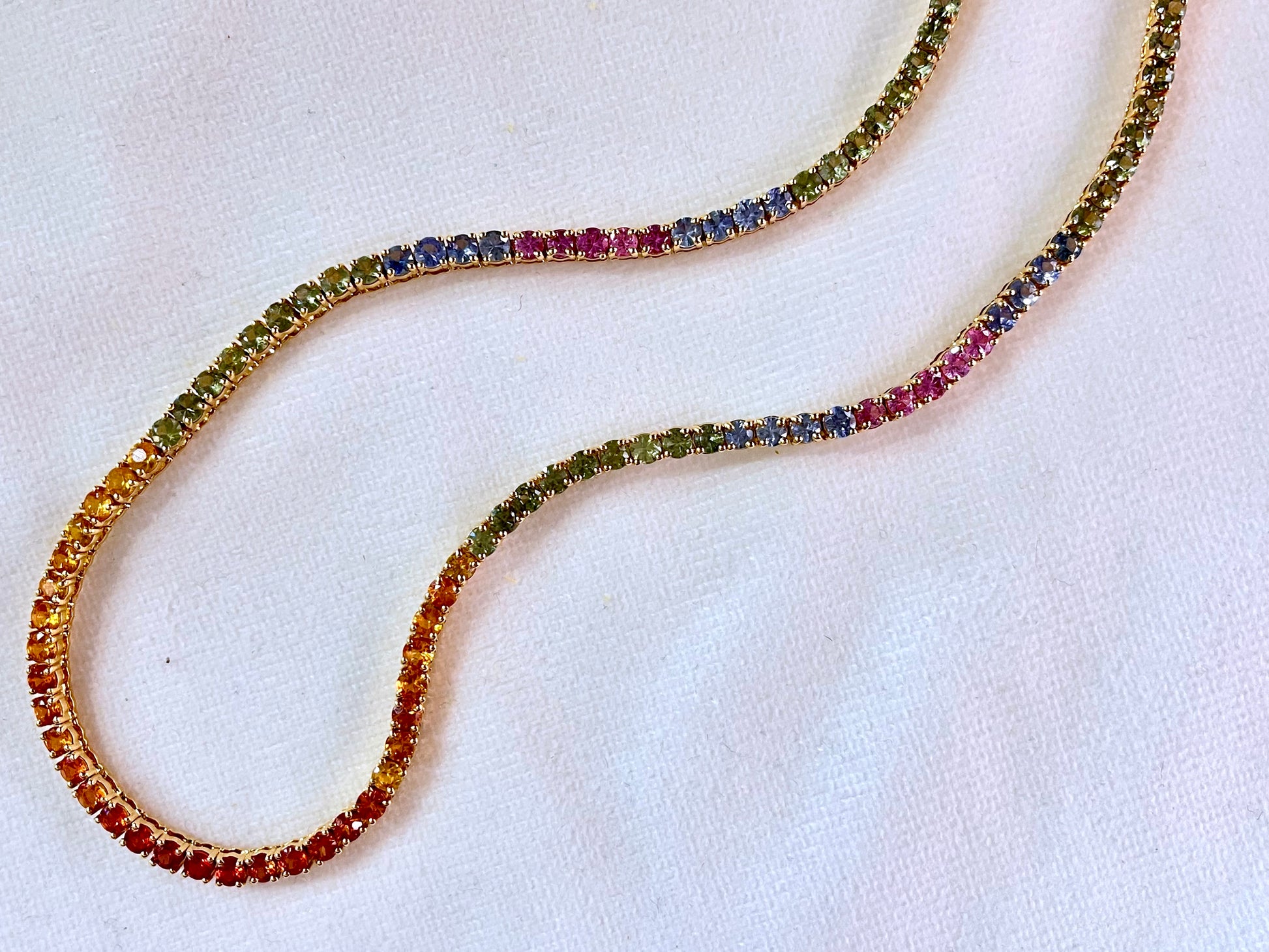 Add a burst of color and luxury to your collection with this 14K Yellow Gold Tennis Necklace featuring 3mm round natural Rainbow Sapphire gemstones. Each sapphire is hand-selected for its vibrant hue and brilliance, creating a mesmerizing gradient of color around your wrist.
